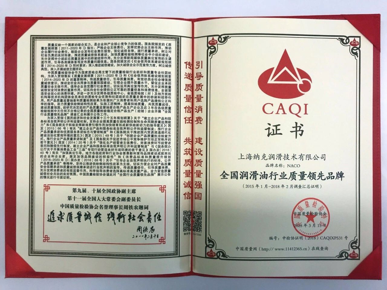 在今年的3.15國際消費者權益日,上海納克被中國質量檢驗協會授予“全國產品和服務質量誠信示范企業”、“全國潤滑油行業質量領先品牌”榮譽證書。