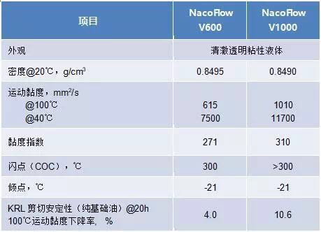 超高黏度茂金屬PAO(mPAO)基礎(chǔ)油在黏度指數(shù)、低溫流動(dòng)性、剪切安定性等多方面具有優(yōu)異的性能,可作為黏度指數(shù)改進(jìn)劑用于車輛齒輪油中,改進(jìn)剪切安定性。目前,上海納克已商業(yè)化兩個(gè)超高黏度mPAO產(chǎn)品NacoFlow V600和NacoFlow V1000,100℃運(yùn)動(dòng)黏度分別達(dá)到了600mm2/s和1000mm2/s,目前國際上還沒有第二家能提供同等黏度的商業(yè)化mPAO產(chǎn)品。NacoFlow V600和V1000的基本性能見表1。NacoFlow V600與V1000比較,黏度較小,所以其剪切安定性更好,其在車輛齒輪油中具有更好的應(yīng)用前景。