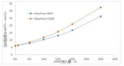 NacoFlow V600和V1000也具有良好的增稠能力,其在150N的III類基礎(chǔ)油中的增稠能力曲線見圖1。
