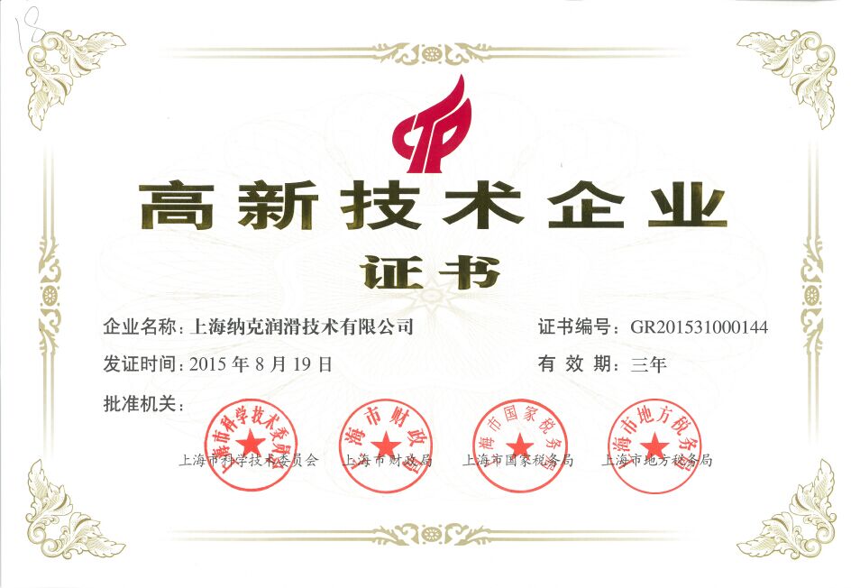 上海納克潤滑技術有限公司從2015年以來,積極開展國家高新技術企業復審工作,近日順利通過認定,并收到了由上海市科學技術委員會、上海市財政局、上海市國家稅務局和上海市地方稅務局聯合頒發的《國家高新技術企業證書》。此次通過復審認定后,納克潤滑將享受國家關于高新技術企業的相關優惠政策。