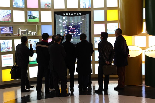 吳董為王市長一行講解化工區展示廳LED屏幕上的“石油化工產品鏈”并進行交流